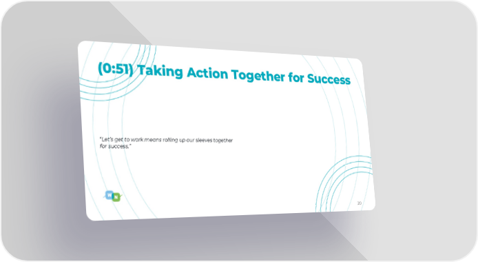 20 (0:51) Taking Action Together for Success “Let’s get to work means rolling up our sleeves together for success.”