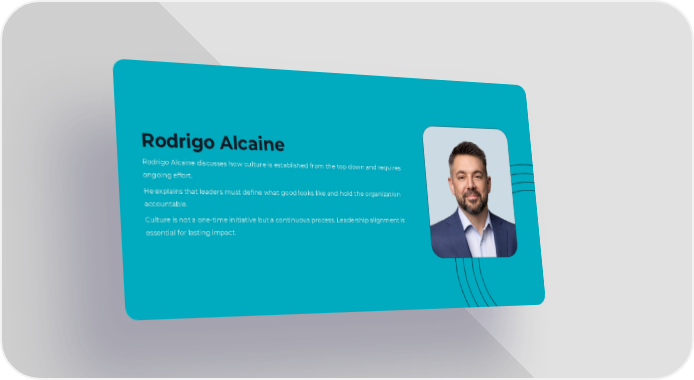 Rodrigo Alcaine Rodrigo Alcaine discusses how culture is established from the top down and requires ongoing effort. He explains that leaders must define what good looks like and hold the organization accountable. Culture is not a one-time initiative but a continuous process. Leadership alignment is essential for lasting impact.
