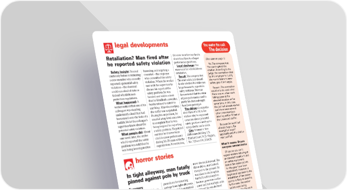 legal developments Safety insight: Proceed cautiously before terminating a crew member who recently reported a potential safety violation – the dismissal could run afoul of state or federal whistleblower- protection regulations. What happened: A worker noticed that one of his colleagues was standing underneath a load that had been raised onto the forks of a forklift. He let the colleague’s supervisor know about the potential safety violation. What people did: About one week later, the staffer who’d reported the safety problem was told that he was being investigated for harassing and targeting a coworker – the employee who committed the safety violation. When the worker met with his supervisor to discuss his report of the safety problem, he was berated and told to admit that he’d bullied a coworker, but he refused to admit to anything. After the meeting, the staffer was suspended. During his suspension, he emailed a top-level executive to complain that he was being targeted for reporting a safety problem. He pointed out that he’d never been cited for poor performance during his 25 years with the organization. Nevertheless, the crew member was fired a short time later for alleged performance problems. Legal challenge: The man sued for whistleblower retaliation. Result: The company lost. The court said a jury should decide whether the staffer was let go because he reported a safety violation. The man demonstrated that the claim of poor performance used to justify his dismissal might have been pretextual. The skinny: Companies that think it’s OK to fire staffers who’ve expressed concerns about potential safety problems rarely get a sympathetic ear in court. Cite: Wimmer v. New Millennium Building, U.S. District Court, W.D. Virginia, No. 7:25-cv-599, 2/10/26. horror stories Summary A man who hadn’t been trained in safety procedures was fatally pinned between a garbage truck and a pole. The incident A three-person crew working for the Baltimore, MD, Department of Public Works (DPW) was assigned to pick up garbage cans that had been placed by residents at the end of a long, narrow alleyway. One of the men was operating the vehicle while the other two were picking up the garbage cans and dumping their contents into the truck’s compactor. Even though the DPW was in the process of developing procedures for removing garbage from tight alleyways, the men hadn’t been trained to walk behind the truck to allow the driver to see them in the rearview mirror. Because there was only 7.2 inches of clearance between the truck and the walls, the driver slowly backed the vehicle down the alleyway. As he was doing so, one of the workers, Timothy Cartwell, walked to the side of the vehicle. Without warning, Cartwell was pinned between the garbage truck and a telephone pole. The response Cartwell screamed in agony and told the driver to move the truck forward. The driver did so, and Cartwell slumped to the ground. He was taken to the hospital, but he’d suffered a pelvic fracture, gone into cardiac arrest and lost multiple units of blood. He was declared dead later that day. The aftermath Following the incident, Cartwell’s family called for the DPW to finish developing its procedures for picking up garbage cans in alleyways. “We don’t want anything to happen to any other family,” said Cartwell’s brother Cornelius Carroll. “We just want things done in the way they should be. Safety measures have to be adhered to. People have to be held accountable for their actions.” February 23, 2026 Safety Alert for Supervisors 3 You make the call: The decision (See case on page 1) No. The company lost. The court upheld the citation. According to the judge, the exemption cited by the employer to justify the man’s failure to wear safety gear didn’t apply. Reason: The exemption could only be used when there was no other work taking place at the elevated location at the same time. In this case, the job had already started and there were several other crew members laboring within 10 feet of the unsecured staffer. Because the work had already begun, the exemption wasn’t applicable and the citation was justified. What it means: Ensure everyone communicates Of course you can’t expect workers laboring at an elevated location to put on safety equipment before the anchor points for the gear have been established. However, a haphazard approach to the installation of the anchor points is likely to backfire. In this case, the anchor points were being identified after the work had already started, which means that the staffers laboring at the elevated location weren’t protected. Better: Make sure your crew members adequately communicate so that work is never allowed to begin at an elevated location until after the anchor points have been set up. Based on Wayne’s Roofing Inc. v. Washington State Department of Labor & Industries. Retaliation? Man fired after he reported safety violation In tight alleyway, man fatally pinned against pole by truck