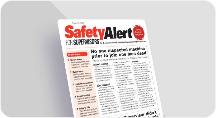 Incident summary A crew member suffered fatal injuries at the bottom of a trench when a quick coupler for an excavator bucket failed, causing the bucket to detach from the boom and crush him. What happened A two-person work crew was installing pipes at the bottom of a 9-foot-deep trench. One of the staff members had descended into the hole so he could attach pipes that were already in the excavation. The staffer in the trench had also positioned himself directly underneath the excavator so he could act as a spotter for the operator of the large machine. After digging out another section of the trench, the excavator operator used the controls to curl the bucket at the end of the boom. Without warning, the bucket detached from the excavator’s quick coupler and landed on the employee in the trench. The excavator operator dialed 9-1-1 and used a chain attached to the boom on the excavator to pull the bucket off the victim. By the time emergency responders arrived, however, the 67-year- old man at the bottom of the trench was already dead from his severe blunt force injuries. Findings The quick coupler that unexpectedly detached from the boom of the excavator had recently been repaired. However, no one had verified that the repair had been done properly. In addition, the worker operating the excavator didn’t inspect the equipment prior to the job. An inspection might have revealed that the quick coupler was broken – before it catastrophically failed and caused a fatal injury. Furthermore, the staff member at the bottom of the trench shouldn’t have positioned himself directly underneath the swing radius of the excavator’s boom. No one inspected machine prior to job; one man dead Worker crushed when excavator bucket detaches from boom You make the call: Supervisor didn’t know staffer was violating work rule “ W e have a rule that forbids employees from handling potentially explosive materials,” said George, the supervisor. “Unfortunately, in this case, one of our crew members disobeyed our work rule.” “Exactly,” replied Tammy, the compliance officer. “Plus, our safety regulations prohibit staffers from working with explosives if they haven’t been trained. You had an untrained man handling explosives, so I’m citing you.” “After a supervisor for a different contract crew asked our staffer to help with a task,” said George, “our guy held a pipe that contained explosives for a couple of minutes. And he played no role in the explosion that led to your inspection.” Doesn’t matter “It doesn’t matter whether your worker played a role in the incident,” said Tammy. “He shouldn’t have been handling explosives.” “Our man was trained not to handle explosives and to move a safe distance away from them,” said George. “However, like I said, he disregarded our policy on working with explosives. But we couldn’t have known about his rule violation because he was holding the pipe for just a couple of minutes, and his supervisor didn’t see him because the supervisor was in another location at the time of the transgression.” “You can’t dodge the fine by claiming ignorance of the violation,” said Tammy. Weren’t even aware “You’re trying to cite us for an infraction we weren’t even aware of,” said George. “Plus, you can’t penalize us for an alleged offense of our own work rule. We’ll fight your citation.” Did the company win? 2 Safety News Employee dead because supervisors kept broken equipment in service. 2 Quick Ideas Staff members handling repetitive tasks should perform hand exercises. 3 Legal Developments Three men suffer fatal injuries after high wind knocks over aerial lift. 3 Horror Stories Worker trapped in cab of tractor when overhead line lands on his vehicle. 4 Tailgate Talk Why falls through floor openings cause some of the most severe injuries. In this issue ■ Make your call, then go to page 3 for the court’s ruling. March 23, 2026 SafetyAlert FOR SUPERVISORS The No. 1 source of actionable information to help supervisors keep their people safe Including: Supervisor’s Safety Toolbox