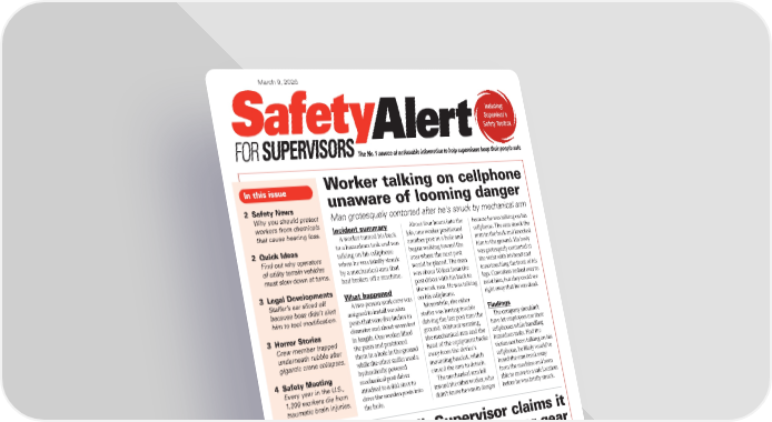 Incident summary A worker turned his back to a hazardous task and was talking on his cellphone when he was fatally struck by a mechanical arm that had broken off a machine. What happened A two-person work crew was assigned to install wooden posts that were five inches in diameter and about seven feet in length. One worker lifted the posts and positioned them in a hole in the ground while the other staffer used a hydraulically powered mechanical post driver attached to a skid steer to drive the wooden posts into the hole. About four hours into the job, one worker positioned another post in a hole and began walking toward the area where the next post would be placed. The man was about 10 feet from the post driver with his back to the work area. He was talking on his cellphone. Meanwhile, the other staffer was having trouble driving the last post into the ground. Without warning, the mechanical arm and the head of the equipment broke away from the device’s mounting bracket, which caused the arm to detach. The mechanical arm fell toward the other worker, who didn’t know he was in danger because he was talking on his cellphone. The arm struck the man in the back and knocked him to the ground. His body was grotesquely contorted at the waist with his head and torso touching the front of his legs. Coworkers rushed over to assist him, but they could see right away that he was dead. Findings The company shouldn’t have let employees use their cellphones while handling hazardous tasks. Had the victim not been talking on his cellphone, he likely would’ve heard the arm break away from the machine and been able to move to a safe location before he was fatally struck. Worker talking on cellphone unaware of looming danger Man grotesquely contorted after he's struck by mechanical arm You make the call: Supervisor claims it wasn’t feasible for staffer to wear gear “ I t wasn’t feasible for that crew member to wear fall protection gear while he was laboring atop a railcar, because there was nowhere for him to attach his safety harness and lanyard,” said George, the supervisor. “That’s a pretty weak argument,” replied Tammy, the compliance officer, “considering that your unprotected worker lost his balance and fell off the railcar. He suffered some pretty severe injuries.” “The injury incident was unfortunate,” said George. “However, the employee couldn’t have used fall protection because there were no stationary structures nearby for him to set up an anchor point to which he could’ve attached his gear.” Changed procedures “The railcar was positioned about 300 yards from a loading facility,” said Tammy. “You could’ve changed your procedures so that railcars were moved into the stationary structure before anyone was allowed to stand atop railcars. There are many potential anchor points within the loading facility. I’m citing you for violating our fall protection regulation.” “It would significantly slow down our operation if we were forced to move all our railcars into a stationary structure before anyone could climb atop them,” said George. “It might slow things down,” said Tammy, “but you have a legal obligation to keep your people safe.” Keep people safe “Of course we want to keep our people safe,” said George. “However, we can’t institute safety procedures that aren’t feasible. We’ll challenge your citation.” Did the company win? 2 Safety News Why you should protect workers from chemicals that cause hearing loss. 2 Quick Ideas Find out why operators of utility terrain vehicles must slow down at turns. 3 Legal Developments Staffer’s ear sliced off because boss didn’t alert him to tool modification. 3 Horror Stories Crew member trapped underneath rubble after gigantic crane collapses. 4 Safety Meeting Every year in the U.S., 1,200 workers die from traumatic brain injuries. In this issue ■ Make your call, then go to page 3 for the court’s ruling. March 9, 2026 SafetyAlert FOR SUPERVISORS The No. 1 source of actionable information to help supervisors keep their people safe Including: Supervisor’s Safety Toolbox