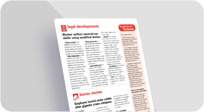 legal developments Safety insight: Now might be a good time to remind your crew members that it’s rarely a good idea to modify hazardous equipment in order to increase efficiency. What happened: A staff member was told by his supervisor to clean a floor using a device that sprayed highly pressurized water through a hose fitted with a nozzle. The staffer didn’t know that someone had modified the nozzle to increase the volume of pressurized water coming out of the hose to improve the device’s efficiency. The man’s boss was aware of the modification. What people did: As soon as the worker turned on the equipment, a blast of highly pressurized water sprayed out of the hose, which caused the hose and the nozzle to kick back forcefully and strike the staffer in the head. He suffered head trauma, a broken clavicle and a severed ear. Legal challenge: The injured man sued his employer, arguing that he was entitled to damages beyond workers’ comp because the manufacturer of the device had warned the company not to modify the nozzle. He also noted that the organization was cited for a safety violation after the incident. Result: The company won. The court said the staffer failed to prove he was eligible for benefits beyond workers’ comp. Yes, the employer negligently modified the equipment, but the company didn’t know for sure that the modification would cause the man’s injury, which was the legal bar he needed to surpass in order to get damages beyond comp. The skinny: Injured staff members usually have a hard time convincing a judge that their employer knew they’d get hurt. Cite: Razo v. County of Orange, Court of Appeal of California, No. G064631, 2/3/26. horror stories Summary A man who followed in his father’s footsteps to spend his life working as a professional pile driver was fatally crushed underneath a collapsed 250- ton-capacity crane. The incident After Paul Ledwell graduated from Silver Lake Regional High School in Kingston, MA, there wasn’t much question about what he’d do for a living. He’d grown up watching his dad labor as a pile driver, and he wanted to pursue the same career. Ledwell's job as a pile driver took him to many places, including New York and Florida, but he eventually returned to Massachusetts and took a position as a pile driver with ACK Marine. When ACK Marine became a subcontractor on a project to demolish the former ExxonMobil oil terminal on the Mystic River in Everett, MA, Ledwell was able to work closer to his home in Middleborough, MA. The job required Ledwell to take apart piping systems located on a barge in the river. He was laboring beneath a 250-ton-capacity crane that was being used for the demolition project. One day while Ledwell was on the barge with the rest of his crew, a cable on the gigantic crane snapped and the boom collapsed onto the barge. Ledwell became trapped under the wreckage. The response Responders were able to pull Ledwell, 37, from the rubble, but his injuries were too severe and he was soon declared dead. The aftermath “Paul was a man who embodied the values of hard work and family,” wrote his sister, Darcy Kennedy. “He was a shining example of what it means to dedicate your life to your work and the people you love. As we grieve his loss, we also celebrate the incredible person he was and the legacy he leaves behind.” March 9, 2026 Safety Alert for Supervisors 3 You make the call: The decision (See case on page 1) Yes. The company won. The Occupational Safety and Health Administration (OSHA) Review Commission overturned the citation. The commission said the employer didn’t violate the fall protection rule because there was no feasible way for the staff member to have installed anchor points to which he could’ve attached his safety equipment. And the commission said the company wasn’t required to change its procedures so that railcars were moved into the loading facility before crew members could climb atop them. OSHA had to prove that the change to the organization’s procedures would’ve actually kept people safer, but the agency was unable to do that. What it means: Never take chances with safety While the employer in this case beat back the OSHA citation, it still wound up with an injured worker and significant legal expenses because it failed to make sure the man standing atop the railcar wore his safety gear. That’s why you shouldn’t take chances with staffer safety. If there’s a safer way to handle a task – such as by moving railcars into stationary structures – it’s better to do things that way, even if it means a job might take a little longer. Keep in mind that any potential time savings from shortcuts pale in comparison with the significant cost of a worker injury. Based on Secretary of Labor v. Finley Farmers. Worker suffers severed ear while using modified device Employee buried under rubble after gigantic crane collapses