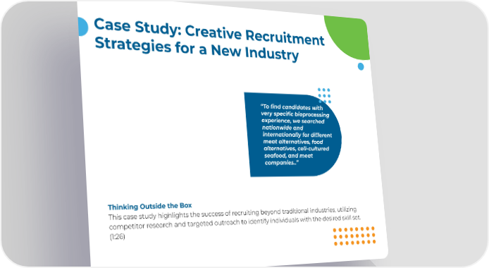 12 Case Study: Creative Recruitment Strategies for a New Industry “To find candidates with very specific bioprocessing experience, we searched nationwide and internationally for different meat alternatives, food alternatives, cell-cultured seafood, and meat companies..” Thinking Outside the Box This case study highlights the success of recruiting beyond traditional industries, utilizing competitor research and targeted outreach to identify individuals with the desired skill set. (1:26)