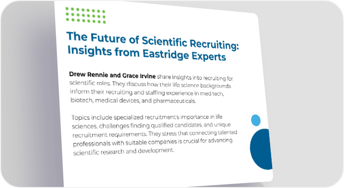 The Future of Scientific Recruiting: Insights from Eastridge Experts Drew Rennie and Grace Irvine share insights into recruiting for scientific roles. They discuss how their life science backgrounds inform their recruiting and staffing experience in med tech, biotech, medical devices, and pharmaceuticals. Topics include specialized recruitment's importance in life sciences, challenges finding qualified candidates, and unique recruitment requirements. They stress that connecting talented professionals with suitable companies is crucial for advancing scientific research and development.