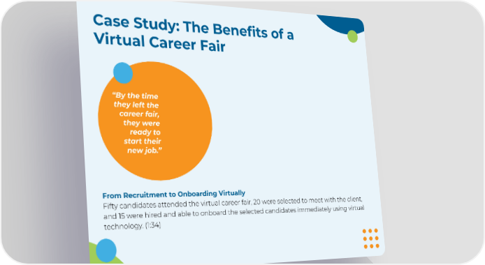 Case Study: The Benefits of a Virtual Career Fair “By the time they left the career fair, they were ready to start their new job.” From Recruitment to Onboarding Virtually Fifty candidates attended the virtual career fair, 20 were selected to meet with the client, and 15 were hired and able to onboard the selected candidates immediately using virtual technology. (1:34)