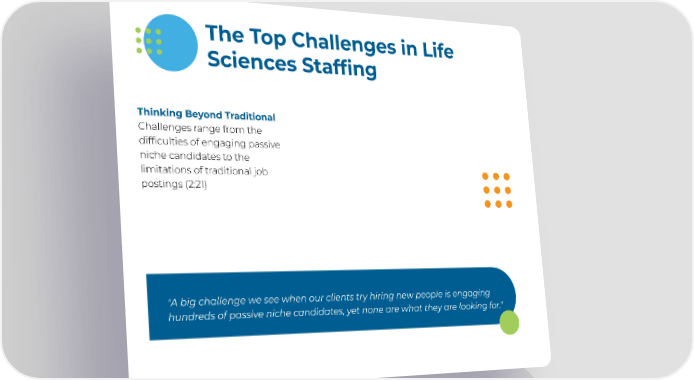 The Top Challenges in Life Sciences Staffing Thinking Beyond Traditional Challenges range from the difficulties of engaging passive niche candidates to the limitations of traditional job postings (2:21) "A big challenge we see when our clients try hiring new people is engaging hundreds of passive niche candidates, yet none are what they are looking for."
