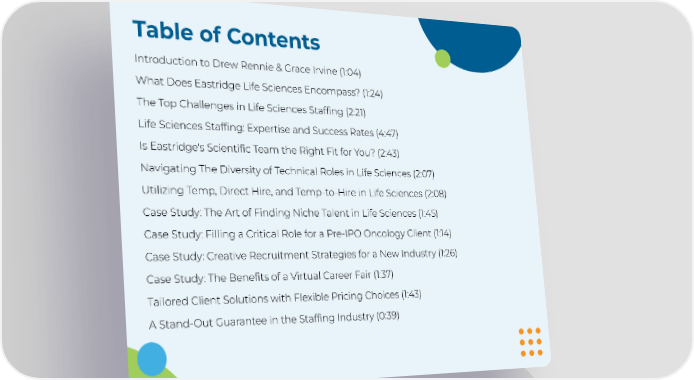 Table of Contents Introduction to Drew Rennie & Grace Irvine (1:04) What Does Eastridge Life Sciences Encompass? (1:24) The Top Challenges in Life Sciences Staffing (2:21) Life Sciences Staffing: Expertise and Success Rates (4:47) Is Eastridge's Scientific Team the Right Fit for You? (2:43) Navigating The Diversity of Technical Roles in Life Sciences (2:07) Utilizing Temp, Direct Hire, and Temp-to-Hire in Life Sciences (2:08) Case Study: The Art of Finding Niche Talent in Life Sciences (1:45) Case Study: Filling a Critical Role for a Pre-IPO Oncology Client (1:14) Case Study: Creative Recruitment Strategies for a New Industry (1:26) Case Study: The Benefits of a Virtual Career Fair (1:37) Tailored Client Solutions with Flexible Pricing Choices (1:43) A Stand-Out Guarantee in the Staffing Industry (0:39)
