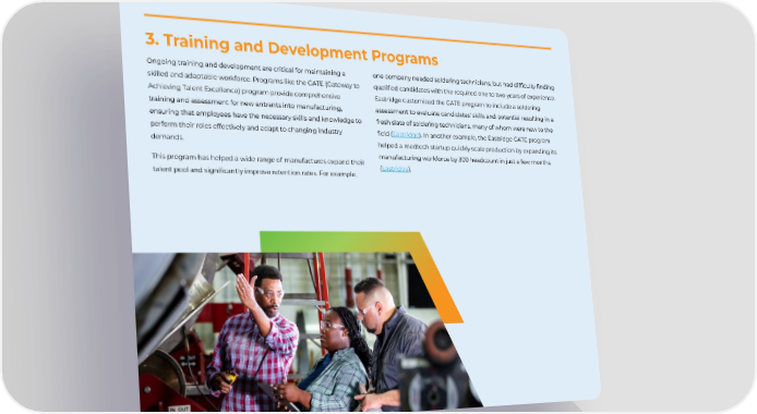 3. Training and Development Programs Ongoing training and development are critical for maintaining a one company needed soldering technicians, but had difûculty ûnding skilled and adaptable workforce. Programs like the GATE (Gateway to qualiûed candidates with the required one to two years of experience. Achieving Talent Excellence) program provide comprehensive Eastridge customized the GATE program to include a soldering training and assessment for new entrants into manufacturing, assessment to evaluate candidates' skills and potential resulting in a ensuring that employees have the necessary skills and knowledge to fresh slate of soldering technicians, many of whom were new to the perform their roles effectively and adapt to changing industry ûeld (Eastridge). In another example, the Eastridge GATE program demands. helped a medtech startup quickly scale production by expanding its manufacturing workforce by 300 headcount in just a few months This program has helped a wide range of manufactures expand their (Eastridge). talent pool and signiûcantly improve retention rates. For example,