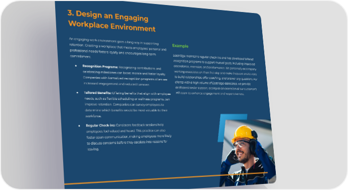 3. Design an Engaging Workplace Environment An engaging work environment goes a long way in supporting Example retention. Creating a workplace that meets employees' personal and professional needs fosters loyalty and encourages long-term Eastridge maintains regular check-ins and has developed tailored commitment. recognition programs to support mutual goals, including improved attendance, retention, and performance. We personally accompany ● Recognition Programs: Recognizing contributions and working associates on their first day and make frequent onsite visits celebrating milestones can boost morale and foster loyalty. to build relationships, offer coaching, and answer any questions. For Companies with formalized recognition programs often see clients with a high volume of Eastridge associates, we provide increased engagement and reduced turnover. dedicated onsite support, acting as an extension of our customer’s HR team to enhance engagement and responsiveness. ● Tailored Benefits: Offering beneûts that align with employee needs, such as üexible scheduling or wellness programs, can improve retention. Companies can survey employees to determine which beneûts would be most valuable to their workforce. ● Regular Check-ins: Consistent feedback sessions help employees feel valued and heard. This practice can also foster open communication, making employees more likely to discuss concerns before they escalate into reasons for leaving.