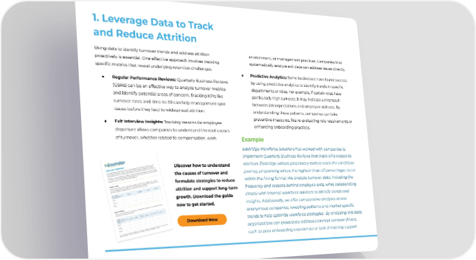 1. Leverage Data to Track and Reduce Attrition environment, or management practices. Companies that Using data to identify turnover trends and address attrition systematically analyze exit data can address issues directly. proactively is essential. One effective approach involves tracking speciûc metrics that reveal underlying retention challenges. ● Predictive Analytics: Some businesses have found success by using predictive analytics to identify trends in speciûc ● Regular Performance Reviews: Quarterly Business Reviews departments or roles. For example, if certain roles have (QBRs) can be an effective way to analyze turnover metrics particularly high turnover, it may indicate a mismatch and identify potential areas of concern. Tracking KPIs like between job expectations and employee skill sets. By turnover rates and time-to-ûll can help management spot understanding these patterns, companies can take issues before they lead to widespread attrition. preventive measures, like re-evaluating role requirements or ● Exit Interview Insights: Tracking reasons for employee enhancing onboarding practices. departure allows companies to understand the root causes of turnover, whether related to compensation, work Example Eastridge Workforce Solutions has worked with companies to implement Quarterly Business Reviews that track KPIs related to attrition. Eastridge utilizes proprietary tools to track the candidate Discover how to understand journey, pinpointing where the highest drop-off percentages occur the causes of turnover and within the hiring funnel. We analyze turnover data, including the formulate strategies to reduce frequency and reasons behind employee exits, while collaborating attrition and support long-term closely with internal workforce advisors to identify trends and growth. Download the guide insights. Additionally, we offer comparative analyses across now to get started. anonymous companies, revealing patterns and market-specific trends to help optimize workforce strategies. By analyzing this data, Download Now organizations can proactively address common turnover drivers, such as poor onboarding experiences or lack of training support.