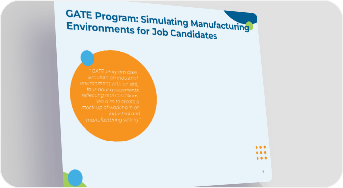GATE Program: Simulating Manufacturing Environments for Job Candidates " GATE program class simulate an industrial environment with on-site, four-hour assessments reflecting real conditions. We aim to create a mock-up of working in an industrial and manufacturing setting." 7