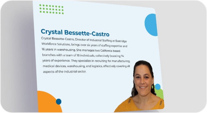 Crystal Bessette-Castro Crystal Bessette-Castro, Director of Industrial Staffing at Eastridge Workforce Solutions, brings over six years of staffing expertise and 16 years in warehousing. She manages two California-based branches with a team of 18 individuals, collectively boasting 74 years of experience. They specialize in recruiting for manufacturing, medical devices, warehousing, and logistics, effectively covering all aspects of the industrial sector.