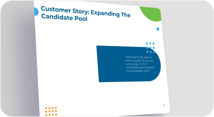 12 Customer Story: Expanding The Candidate Pool “We have to be able to think outside the box of other ways to find candidates and expand the candidate pool.” 12 The GATE Program: Expanding The Highly Qualified Talent Pool Page 11 Page 13Video Player is loading.Play VideoPlaySkip BackwardSkip ForwardMuteCurrent Time 0:00/Duration 1:46Loaded: 0.00%0:00Stream Type LIVESeek to live, currently behind liveLIVERemaining Time -1:46 1xPlayback RateChaptersChaptersDescriptionsdescriptions off, selectedCaptionscaptions settings, opens captions settings dialogcaptions off, selectedAudio TrackPicture-in-PictureFullscreenThis is a modal window.Beginning of dialog window. Escape will cancel and close the window.TextColorWhiteBlackRedGreenBlueYellowMagentaCyanOpacityOpaqueSemi-TransparentText BackgroundColorBlackWhiteRedGreenBlueYellowMagentaCyanOpacityOpaqueSemi-TransparentTransparentCaption Area BackgroundColorBlackWhiteRedGreenBlueYellowMagentaCyanOpacityTransparentSemi-TransparentOpaqueFont Size50%75%100%125%150%175%200%300%400%Text Edge StyleNoneRaisedDepressedUniformDrop shadowFont FamilyProportional Sans-SerifMonospace Sans-SerifProportional SerifMonospace SerifCasualScriptSmall CapsResetDoneClose Modal DialogEnd of dialog window.