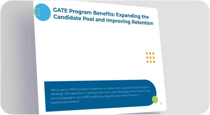 GATE Program Benefits: Expanding the Candidate Pool and Improving Retention "We’ve seen a 300% increase in retention at clients that utilized the GATE Program. Moreover, 50% reduction in training time, and output doubling, with a 12.5% shorter time compared to non-GATE candidates, matching the performance of experienced workers.” 5