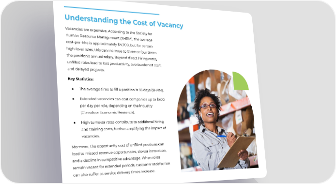 Understanding the Cost of Vacancies are expensive. According to the Society for Human Resource Management (SHRM), the average cost-per-hire is approximately $4,700, but for certain high-level roles, this can increase to three or four times the position's annual salary. Beyond direct hiring costs, unfilled roles lead to lost productivity, overburdened staff, and delayed projects. Key Statistics: ● The average time to fill a position is 36 days (SHRM). ● Extended vacancies can cost companies up to $500 per day per role, depending on the industry (Glassdoor Economic Research). ● High turnover rates contribute to additional hiring and training costs, further amplifying the impact of vacancies. Moreover, the opportunity cost of unfilled positions can lead to missed revenue opportunities, slower innovation, and a decline in competitive advantage. When roles remain vacant for extended periods, customer satisfaction can also suffer as service delivery times increase. Understanding the Cost of Vacancy