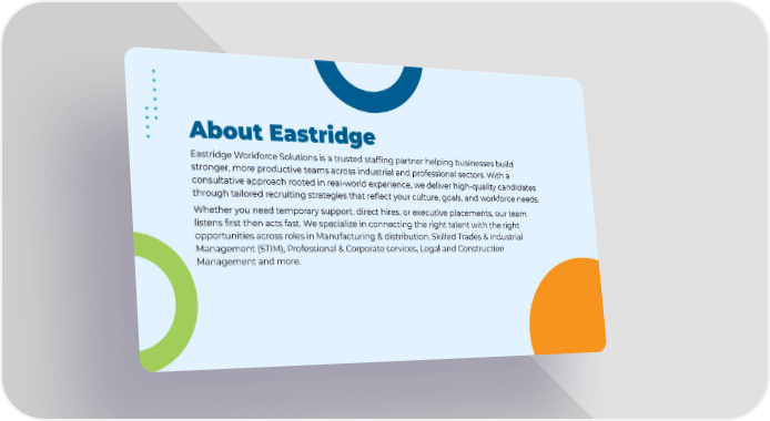 About Eastridge Eastridge Workforce Solutions is a trusted staffing partner helping businesses build stronger, more productive teams across industrial and professional sectors. With a consultative approach rooted in real-world experience, we deliver high-quality candidates through tailored recruiting strategies that reflect your culture, goals, and workforce needs. Whether you need temporary support, direct hires, or executive placements, our team listens first then acts fast. We specialize in connecting the right talent with the right opportunities across roles in Manufacturing & distribution, Skilled Trades & Industrial Management (STIM), Professional & Corporate services, Legal and Construction Management and more.