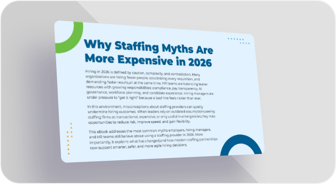Why Staffing Myths Are More Expensive in 2026 Hiring in 2026 is defined by caution, complexity, and contradiction. Many organizations are hiring fewer people, scrutinizing every requisition, and demanding faster results,all at the same time. HR teams are balancing leaner resources with growing responsibilities: compliance, pay transparency, AI governance, workforce planning, and candidate experience. Hiring managers are under pressure to "get it right" because a bad hire feels riskier than ever. In this environment, misconceptions about staffing providers can quietly undermine hiring outcomes. When leaders rely on outdated assumptions,seeing staffing firms as transactional, expensive, or only useful in emergencies,they miss opportunities to reduce risk, improve speed, and gain flexibility. This eBook addresses the most common myths employers, hiring managers, and HR teams still believe about using a staffing provider in 2026. More importantly, it explains what has changed,and how modern staffing partnerships now support smarter, safer, and more agile hiring decisions.