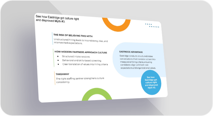 THE RISK OF BELIEVING THIS MYTH Unstructured hiring leads to inconsistency, bias, and mismatched expectations. EASTRIDGE ADVANTAGE Eastridge conducts structured intake conversations that translate culture into measurable hiring criteria, ensuring candidates align with both role expectations and organizational values. HOW MODERN PARTNERS APPROACH CULTURE ● Structured intake sessions ● Behavioral and skills-based screening ● Clear translation of values into hiring criteria TAKEAWAY The right staffing partner strengthens culture consistency. See how Eastridge got culture right and disproved Myth #3. See how Eastridge got culture right and disproved Myth #3.