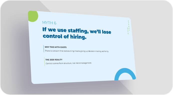 WHY THIS MYTH EXISTS There is concern that outsourcing means giving up decision-making authority. THE 2026 REALITY Control comes from structure, not micromanagement. If we use staffing, we’ll lose control of hiring. MYTH 6