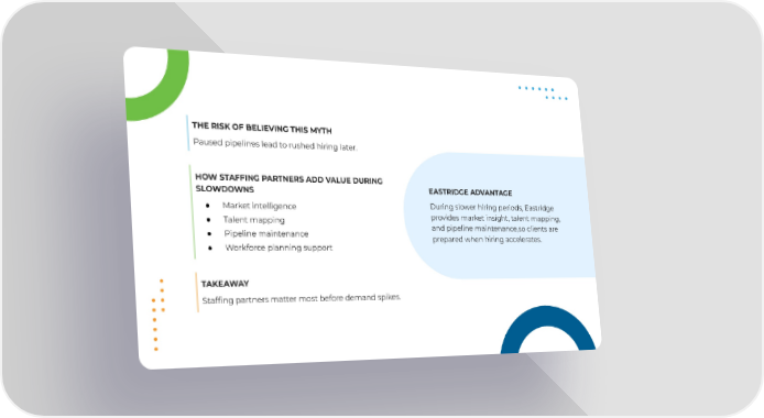 THE RISK OF BELIEVING THIS MYTH Paused pipelines lead to rushed hiring later. EASTRIDGE ADVANTAGE During slower hiring periods, Eastridge provides market insight, talent mapping, and pipeline maintenance,so clients are prepared when hiring accelerates. HOW STAFFING PARTNERS ADD VALUE DURING SLOWDOWNS ● Market intelligence ● Talent mapping ● Pipeline maintenance ● Workforce planning support TAKEAWAY Staffing partners matter most before demand spikes.