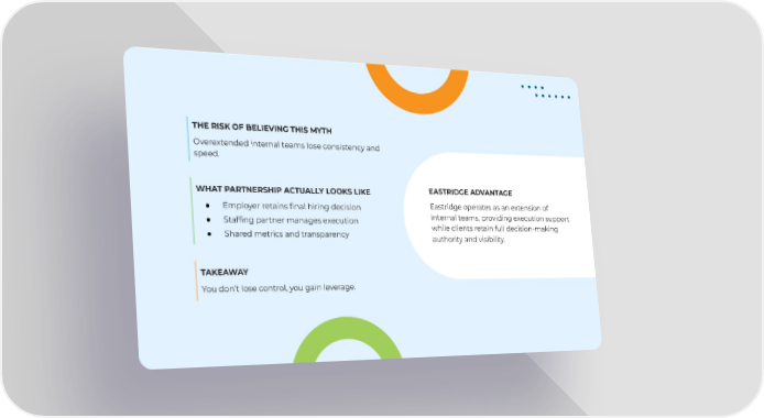 THE RISK OF BELIEVING THIS MYTH Overextended internal teams lose consistency and speed. EASTRIDGE ADVANTAGE Eastridge operates as an extension of internal teams, providing execution support while clients retain full decision-making authority and visibility. WHAT PARTNERSHIP ACTUALLY LOOKS LIKE ● Employer retains final hiring decision ● Staffing partner manages execution ● Shared metrics and transparency TAKEAWAY You don’t lose control, you gain leverage.