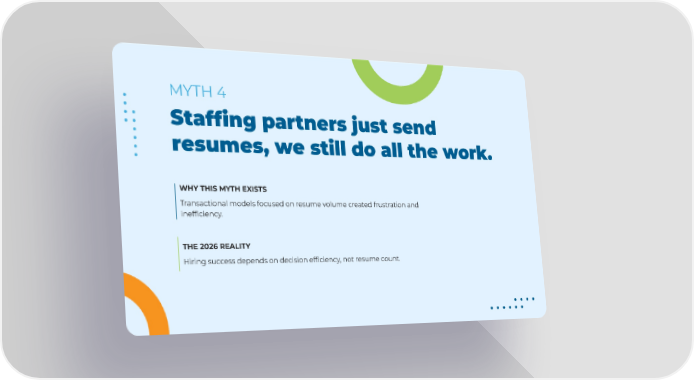 WHY THIS MYTH EXISTS Transactional models focused on resume volume created frustration and inefficiency. THE 2026 REALITY Hiring success depends on decision efficiency, not resume count. Staffing partners just send resumes, we still do all the work. MYTH 4