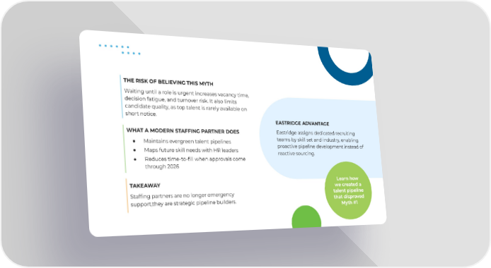 THE RISK OF BELIEVING THIS MYTH Waiting until a role is urgent increases vacancy time, decision fatigue, and turnover risk. It also limits candidate quality, as top talent is rarely available on short notice. EASTRIDGE ADVANTAGE Eastridge assigns dedicated recruiting teams by skill set and industry, enabling proactive pipeline development instead of reactive sourcing. WHAT A MODERN STAFFING PARTNER DOES ● Maintains evergreen talent pipelines ● Maps future skill needs with HR leaders ● Reduces time-to-fill when approvals come through 2026 TAKEAWAY Staffing partners are no longer emergency support,they are strategic pipeline builders. Learn how we created a talent pipeline that disproved Myth #1