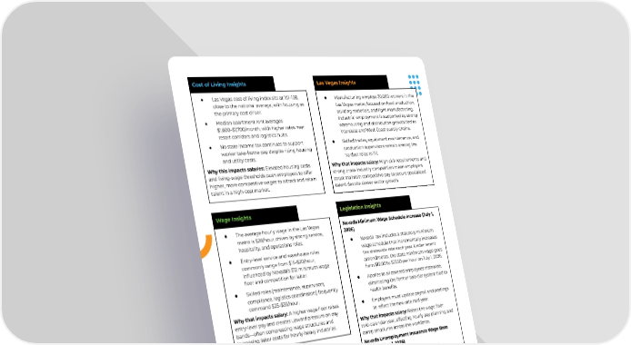 ● Las Vegas cost of living index sits at 101–103, close to the national average, with housing as the primary cost driver. ● Median apartment rent averages $1,600–$1,700/month, with higher rates near resort corridors and logistics hubs. ● No state income tax continues to support worker take-home pay despite rising housing and utility costs. Why this impacts salaries: Elevated housing costs and living-wage thresholds push employers to offer higher, more competitive wages to attract and retain talent in a high-cost market. Cost of Living Insights Nevada Minimum Wage Schedule Increase (July 1, 2026) ● Nevada law includes a statutory minimum wage schedule that incrementally increases the statewide rate each year. Under recent amendments, the state minimum wage goes from $12.00 to $13.50 per hour on July 1, 2026. ● Applies to all covered employees statewide, eliminating the former two-tier system tied to health benefits. ● Employers must update payroll and postings to reflect the new rate mid-year. Why that impacts salary: Raises the wage floor mid-calendar year, affecting hourly pay planning and comp structures across the workforce. Nevada Unemployment Insurance Wage Base Increase (Jan 1, 2026) ● Effective January 1, 2026, Nevada’s unemployment insurance taxable wage base increases from $41,800 to $43,700 per employee. ● This affects the maximum wages subject to employer unemployment tax contributions in Nevada. Why that impacts salary: Increases employer tax exposure tied to payroll and influences effective labor costs. Legislation Insights ● Manufacturing employs 30,000 workers in the Las Vegas metro, focused on food production, building materials, and light manufacturing. Industrial employment is supported by strong warehousing and distribution growth tied to interstate and West Coast supply chains. ● Skilled trades, equipment maintenance, and production supervisors remain among the hardest roles to fill. Why that impacts salary: High skill requirements and strong cross-industry competition mean employers must maintain competitive pay to secure specialized talent despite slower sector growth. Las Vegas Insights ● The average hourly wage in the Las Vegas metro is $28/hour, driven by strong service, hospitality, and operations roles. ● Entry-level service and warehouse roles commonly range from $15–$20/hour, influenced by Nevada’s $12 minimum wage floor and competition for labor. ● Skilled roles (maintenance, supervisors, compliance, logistics coordinators) frequently command $25–$35/hour. Why that impacts salary: A higher wage floor raises entry-level pay and creates upward pressure on pay bands—often compressing wage structures and increasing labor costs for hourly-heavy industries. Wage Insights Request A Custom Salary Guide