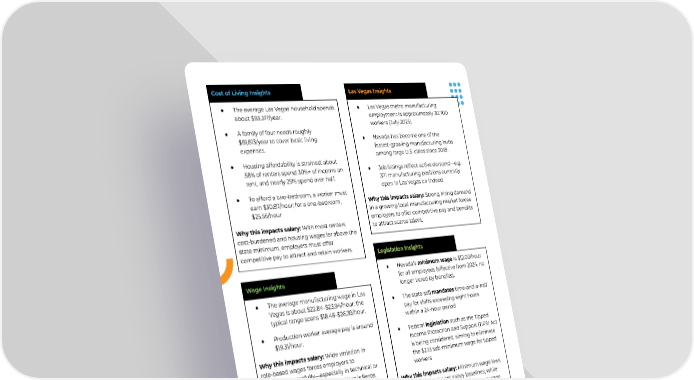 ● The average Las Vegas household spends about $83,317/year. ● A family of four needs roughly $81,813/year to cover basic living expenses. ● Housing affordability is strained: about 58% of renters spend 30%+ of income on rent, and nearly 29% spend over half. ● To afford a two-bedroom, a worker must earn $30.87/hour; for a one-bedroom, $25.56/hour Why this impacts salary: With most renters cost-burdened and housing wages far above the state minimum, employers must offer competitive pay to attract and retain workers. Cost of Living Insights ● Nevada’s minimum wage is $12.00/hour for all employees (effective from 2024, no longer tiered by benefits). ● The state still mandates time-and-a-half pay for shifts exceeding eight hours within a 24-hour period ● Federal legislation such as the Tipped Income Protection and Support (TIPS) Act is being considered, aiming to eliminate the $2.13 sub-minimum wage for tipped workers Why this impacts salary: Minimum wage laws and overtime rules set salary baselines, while potential federal reforms could increase wage vulnerability or demand in tipped-heavy industries like hospitality. Legislation Insights ● Las Vegas metro manufacturing employment is approximately 30,700 workers (July 2025). ● Nevada has become one of the fastest-growing manufacturing hubs among large U.S. cities since 2018. ● Job listings reflect active demand—e.g., 371 manufacturing positions currently open in Las Vegas on Indeed. Why this impacts salary: Strong hiring demand in a growing local manufacturing market forces employers to offer competitive pay and benefits to attract scarce talent. Las Vegas Insights ● The average manufacturing wage in Las Vegas is about $22.84–$23.94/hour; the typical range spans $18.46–$26.39/hour. ● Production worker average pay is around $19.31/hour. Why this impacts salary: Wide variation in role-based wages forces employers to benchmark carefully—especially in technical or engineering roles where competition is fierce. Wage Insights Request A Custom Salary Guide