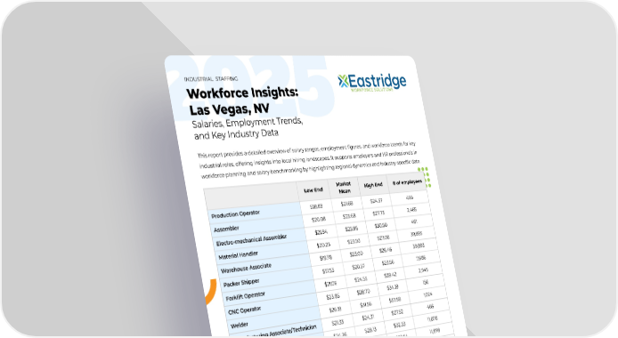 ● The average Las Vegas household spends about $83,317/year. ● A family of four needs roughly $81,813/year to cover basic living expenses. ● Housing affordability is strained: about 58% of renters spend 30%+ of income on rent, and nearly 29% spend over half. ● To afford a two-bedroom, a worker must earn $30.87/hour; for a one-bedroom, $25.56/hour Why this impacts salary: With most renters cost-burdened and housing wages far above the state minimum, employers must offer competitive pay to attract and retain workers. Cost of Living Insights ● Nevada’s minimum wage is $12.00/hour for all employees (effective from 2024, no longer tiered by benefits). ● The state still mandates time-and-a-half pay for shifts exceeding eight hours within a 24-hour period ● Federal legislation such as the Tipped Income Protection and Support (TIPS) Act is being considered, aiming to eliminate the $2.13 sub-minimum wage for tipped workers Why this impacts salary: Minimum wage laws and overtime rules set salary baselines, while potential federal reforms could increase wage vulnerability or demand in tipped-heavy industries like hospitality. Legislation Insights ● Las Vegas metro manufacturing employment is approximately 30,700 workers (July 2025). ● Nevada has become one of the fastest-growing manufacturing hubs among large U.S. cities since 2018. ● Job listings reflect active demand—e.g., 371 manufacturing positions currently open in Las Vegas on Indeed. Why this impacts salary: Strong hiring demand in a growing local manufacturing market forces employers to offer competitive pay and benefits to attract scarce talent. Las Vegas Insights ● The average manufacturing wage in Las Vegas is about $22.84–$23.94/hour; the typical range spans $18.46–$26.39/hour. ● Production worker average pay is around $19.31/hour. Why this impacts salary: Wide variation in role-based wages forces employers to benchmark carefully—especially in technical or engineering roles where competition is fierce. Wage Insights Request A Custom Salary Guide
