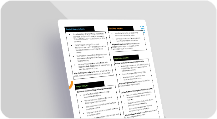 ● Household Spending: San Diego households spend $91,204/year, with housing consuming 37.9% (~$34,554/year ≈ $2,880/month) vs. 33.1% nationally. ● Living Wage: A family of four needs $35.72/hour per adult (~$148,594/year before taxes) to meet basic needs in San Diego County. ● Rent Burden: About 43.4% of households are cost-burdened, paying ≥30% of income toward housing. ● Housing Wage: To afford a 2-bedroom at FY 2025 HUD FMR ($2,881/month), workers must earn $54.48/hour full-time. Why that impacts salary: Pay must reflect real living costs, if companies want to attract and retain talent. Cost of Living Insights Federal Overtime Tax Deduction (2025–2028) ● Workers can now deduct up to $12,500 (single) or $25,000 (joint) of overtime earnings from federal taxable income. ● Applies to tax years 2025 through 2028. ● Especially relevant in overtime-heavy industries like manufacturing. Why that impacts salary: Employers may face less pressure for base wage increases. Captive Audience Meeting Bans (multi-state trend) ● Laws now prohibit employers from forcing workers to attend anti-union or political meetings. ● States with bans include CA, NY, IL, OR, WA (and momentum is spreading). ● Reduces employers’ ability to influence workers during union campaigns. Why that impacts salary: Union drives typically result in higher negotiated wage floors. MMEDS Act ● A 2025 bill (H.R. 3042) proposes tax credits for wages, benefits, and facilities. ● Targets distressed zones to encourage onshore med-device manufacturing. ● Designed to reduce reliance on overseas supply chains. Why that impacts salary: Creates wage competition for specialized med-device workers. Legislation Insights ● Manufacturing makes up about 1 in 10 private-sector jobs in the region. ● San Diego’s manufacturing ecosystem is highly fragmented and competitive. Why that impacts salary: Smaller companies competing with larger employers must offer competitive pay to secure talent. San Diego Insights California Minimum Wage & Exempt Thresholds ● As of Jan 1, 2025, CA’s minimum wage increased to $16.50/hour. ● The exempt salary threshold also rose to $68,640/year (≈ $5,720/month). ● Roles below this threshold cannot legally be classified as exempt. ● Employers must decide to reclassify positions or increase salaries. Why that impacts salary: Raises entry-level pay floors and compresses pay bands upward. Wage Insights Request A Custom Salary Guide