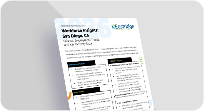 This report provides a detailed overview of salary ranges, employment figures, and workforce trends for key industrial roles, offering insights into local hiring landscapes. It supports employers and HR professionals in workforce planning and salary benchmarking by highlighting regional dynamics and industry-specific data. PROFESSIONAL STAFFING: LEGAL Workforce Insights: San Diego, CA Salaries, Employment Trends, and Key Industry Data ● Employment growth projected at 4.8%, remaining above national average ● Tech employment growth moderates to 2–2.5% YoY as companies prioritize efficiency and AI integration ● Job gains led by healthcare, professional services, and business support roles Employment Growth ● Ongoing effects of California’s $20 fast-food minimum wage continue to influence wage benchmarks ● Employers in adjacent industries face upward pressure on entry-level and hourly pay Minimum Wage Increase ● Median salary across roles increases to $85,000/year ● Ongoing effects of California’s $20 fast-food minimum wage continue to influence wage benchmarks ● Wage growth continues at a cautious pace, constrained by persistent housing and cost-of-living pressures ● Increased focus on automation and workforce optimization to offset labor costs Wage Trends ● Orange County GDP growth projected at 2.2–2.6%, signaling steady but moderate expansion ● Ongoing investment in: a. Technology and AI-enabled business operations b. Healthcare infrastructure and outpatient facilities c. Clean energy and sustainability-focused projects Economic Growth & Trends SB 294 – Workplace Know Your Rights Act Notices ● Starting Feb 1, 2026, employers must provide an annual “Know Your Rights” notice to employees. ● Must cover workers’ comp, immigration protections, union/concerted activity, and rights during law enforcement interactions. ● Must be provided in the employee’s workplace communication language. ● Employees must be able to designate an emergency contact by March 30, 2026. Why that impacts salary: Adds compliance workload and accelerates onboarding/policy standardization. SB 617 – Cal-WARN Notice Updates ● Effective Jan 1, 2026, Cal-WARN notices must include expanded required details. ● Must include local workforce board coordination info and CalFresh assistance contacts. ● If coordinating services, employers must arrange them within 30 days. Why that impacts salary: Increases risk and admin demands during workforce reductions. Legislation Insights